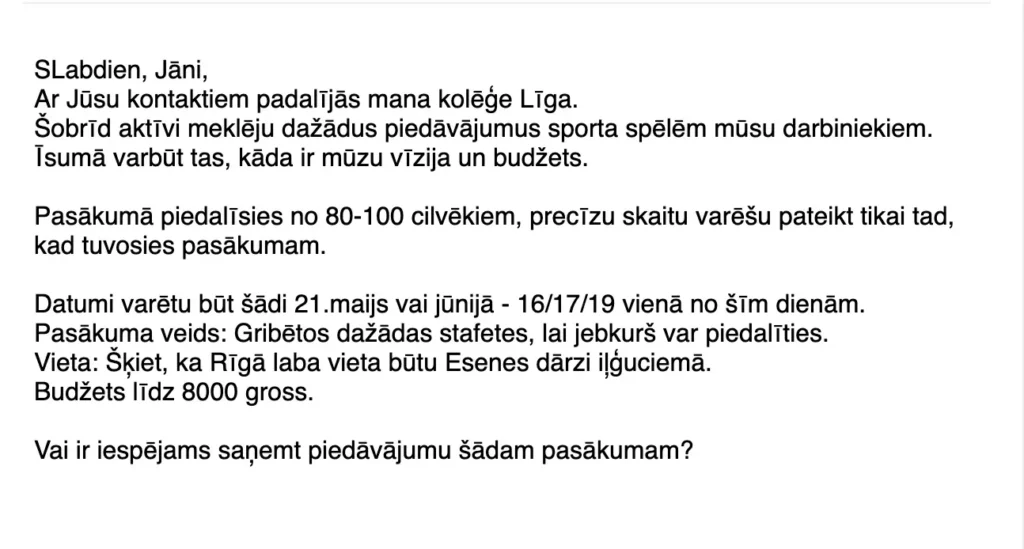 Jānis ir izcils pasākumu vadītājs, kurš strādājis ar tādiem “milžiem” kā Lidl, airBaltic, Microsoft, Samsung un citiem. Mēs izveidojām kampaņu, kas uzrunā tieši mārketinga un HR vadītājus lielākajos Latvijas uzņēmumos un ieguvām atbildes no tādiem zīmoliem kā McDonald’s, Magebit, Mediju Tilts u.c.