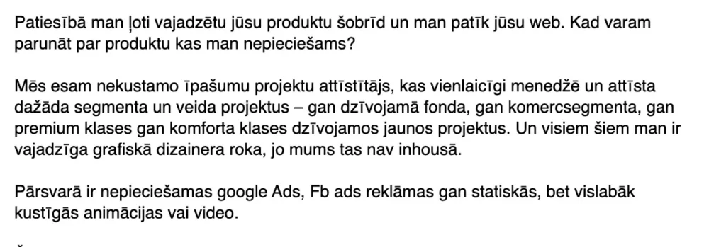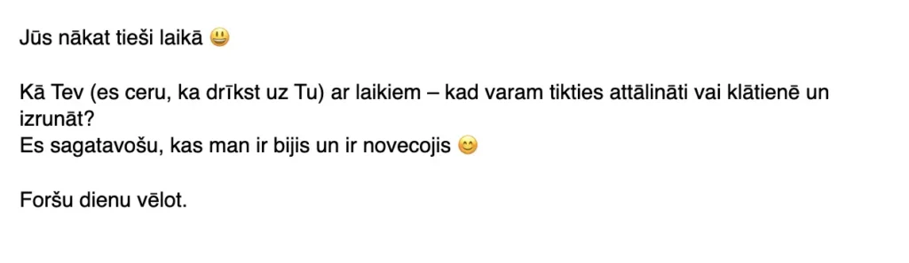 Mēs nelikām dizainus. Nebija pielikumu, bildīšu vai grafiku. Tikai vienkāršs teksts – personīgs, uzrunājošs un ar aicinājumu atbildēt. Tāds, kas izceļas starp pārējiem 101 “newsletter” e-pastiem un aicina cilvēku vienkārši… uz sarunu.